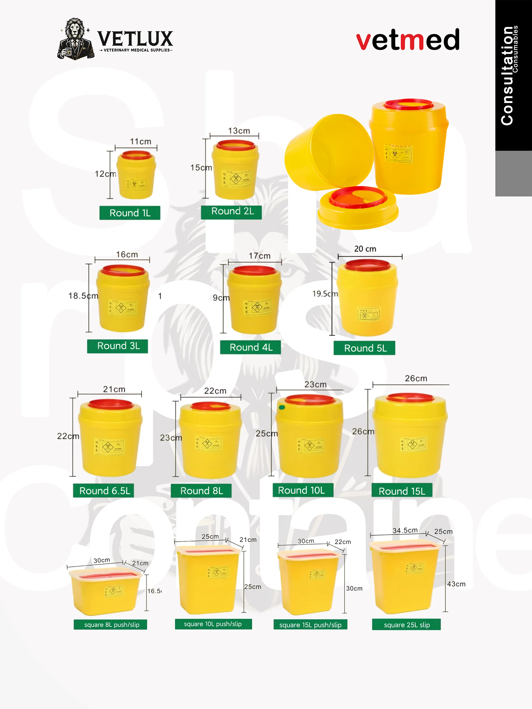 A veterinary sharps container for safe disposal of biohazardous waste (needles, syringes, etc.), available in round/square designs and multiple sizes.