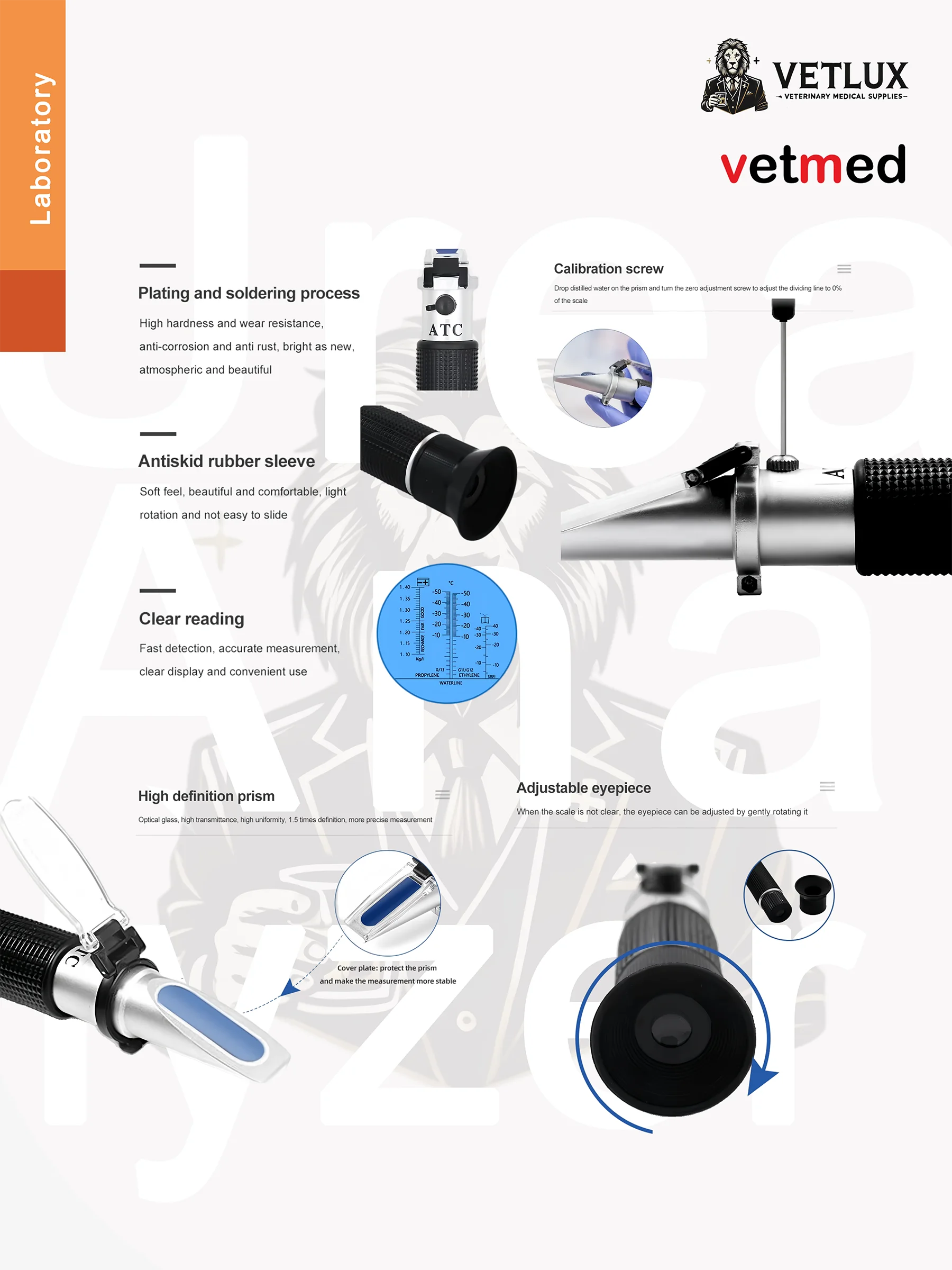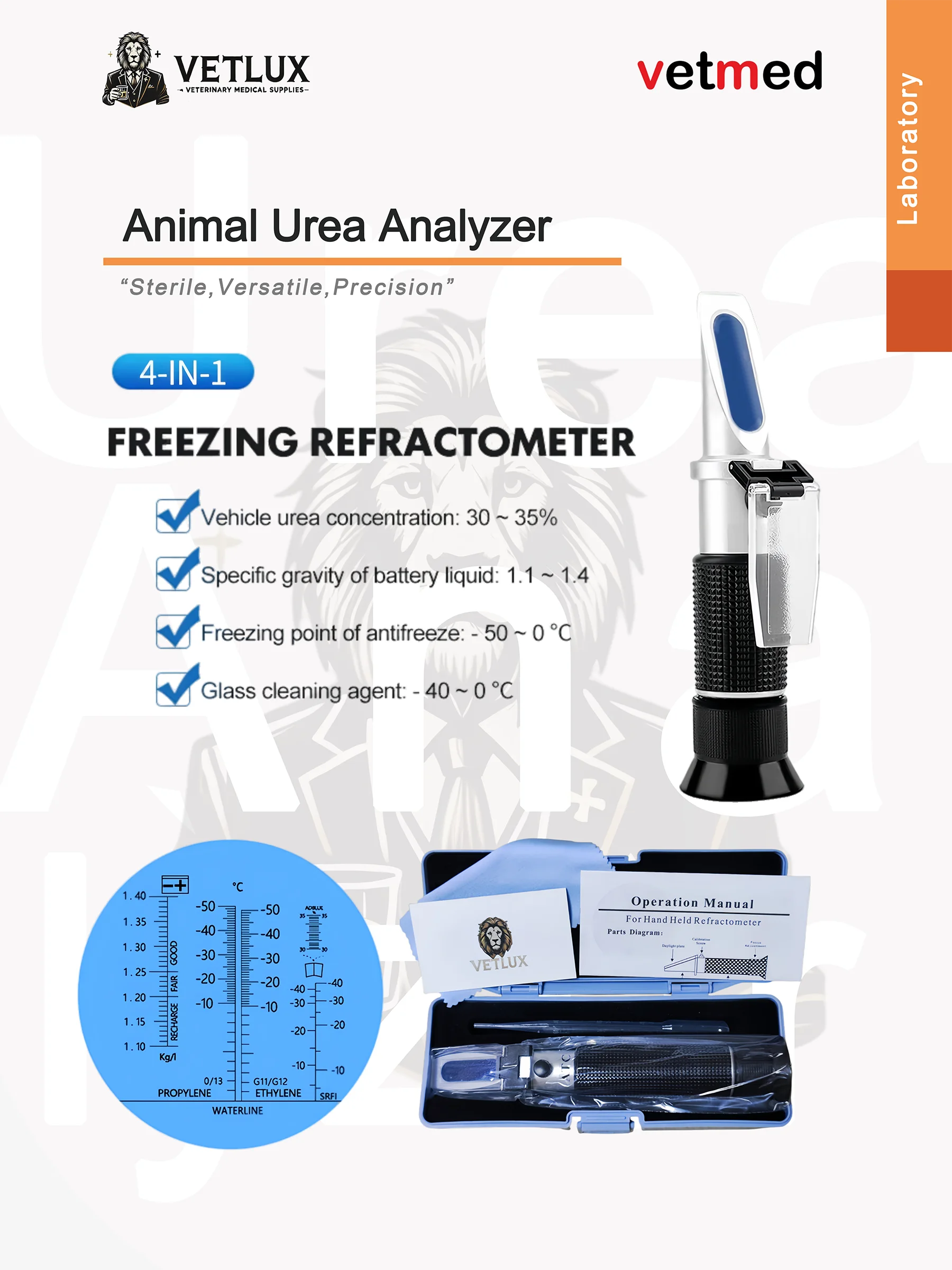 A 4-in-1 veterinary freezing refractometer (marketed as urea analyzer) for multi-purpose concentration/freezing point testing.
